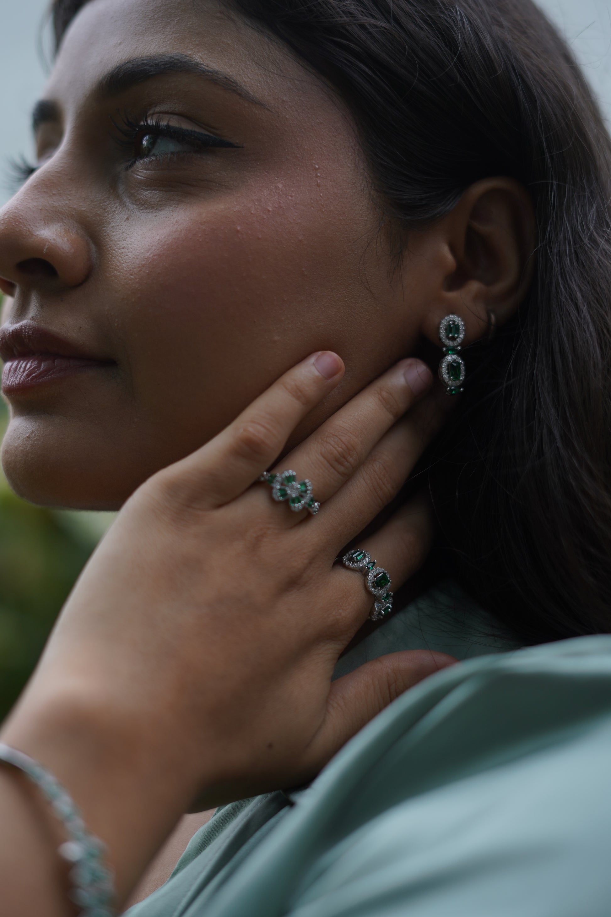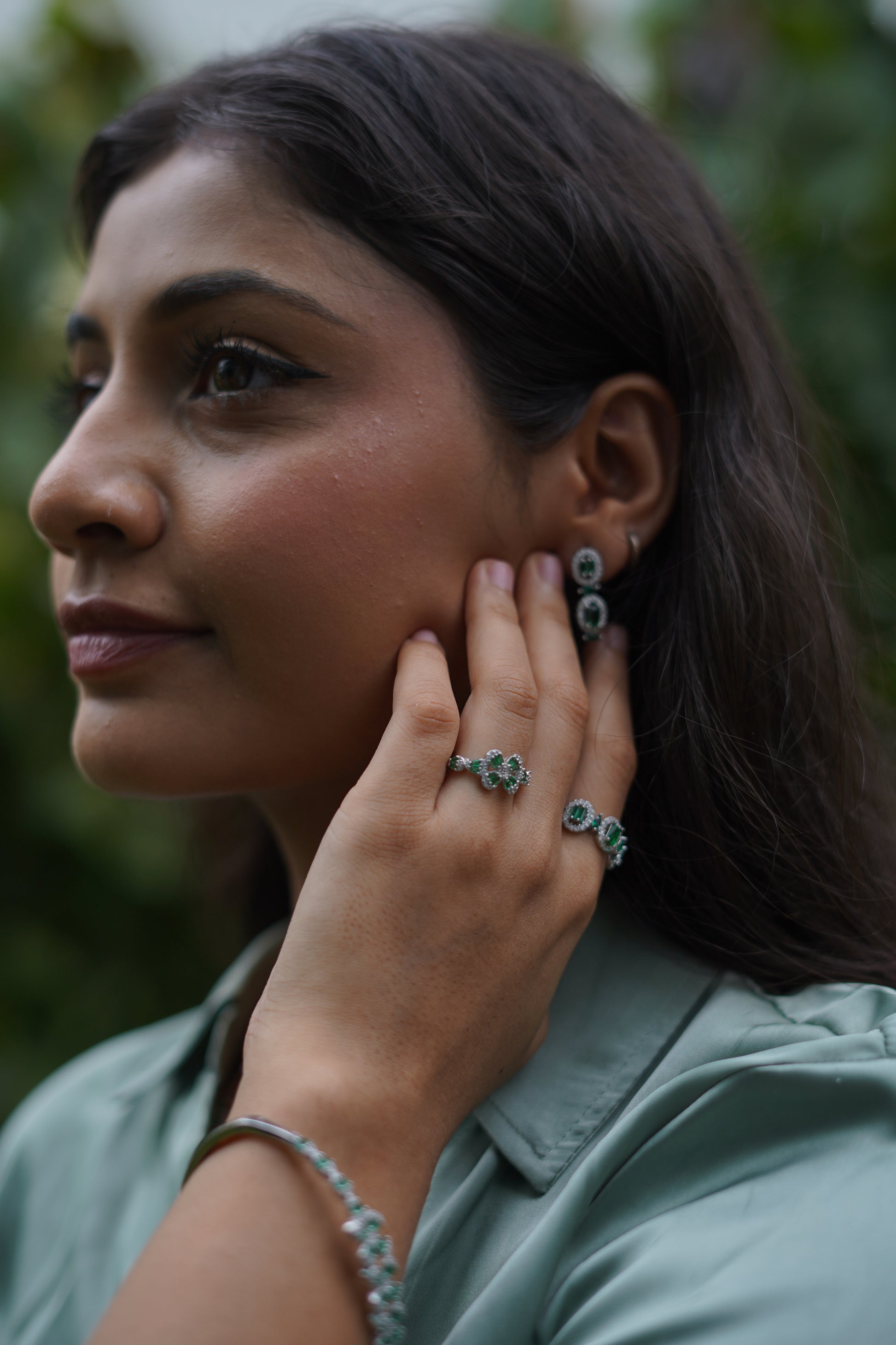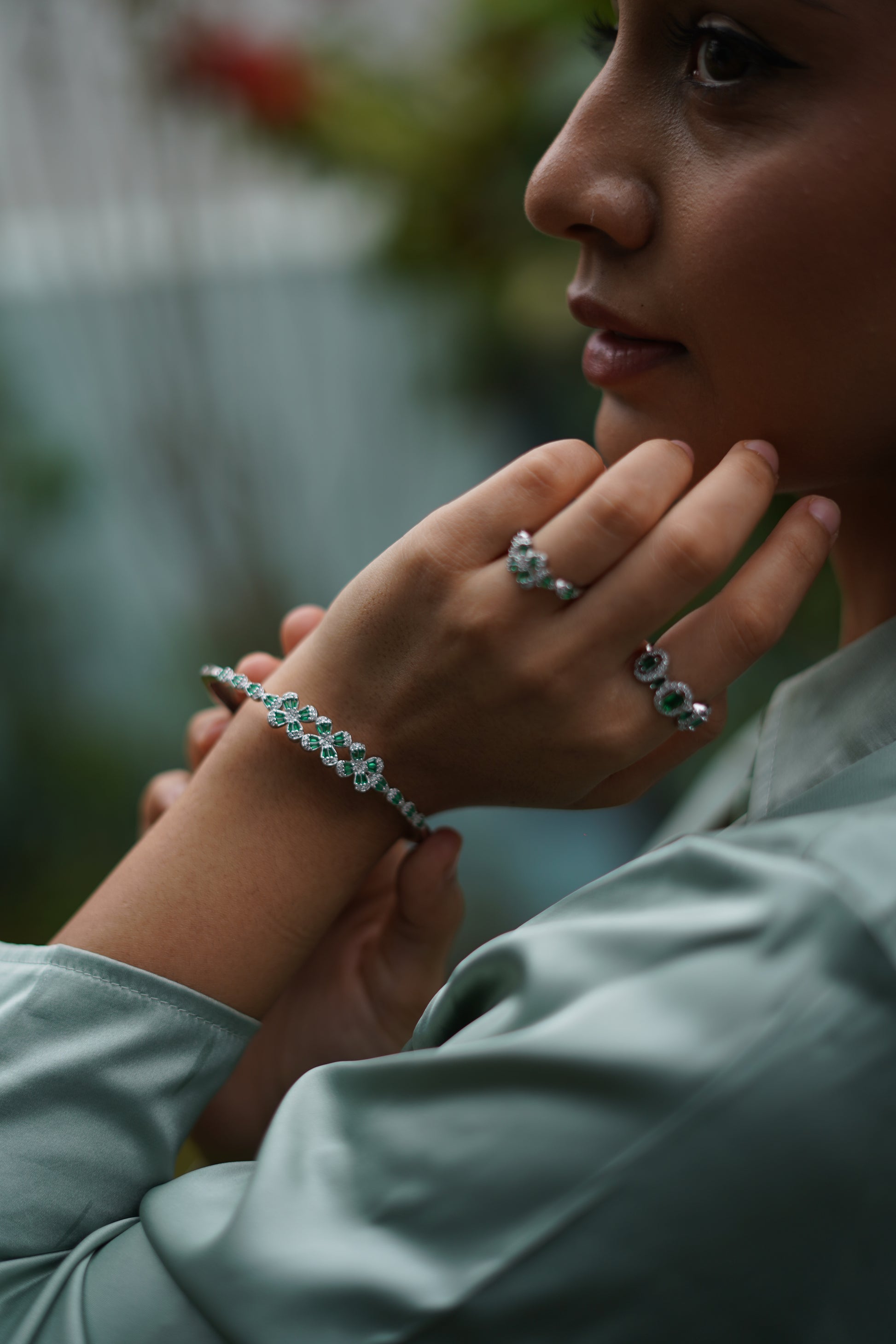 { This set has a NECKLACE , a set of EARRINGS , a RING and a BRACELET } Featuring radiant green stones encased in halos of sparkling white diamonds, this 925 silver set includes a statement necklace, a delicate bracelet, drop earrings, and a perfectly matching ring. Each piece is meticulously crafted with oval-shaped brilliance, blending royalty with modern finesse. Whether worn together for a grand event or styled separately, this set turns every look into a legacy.