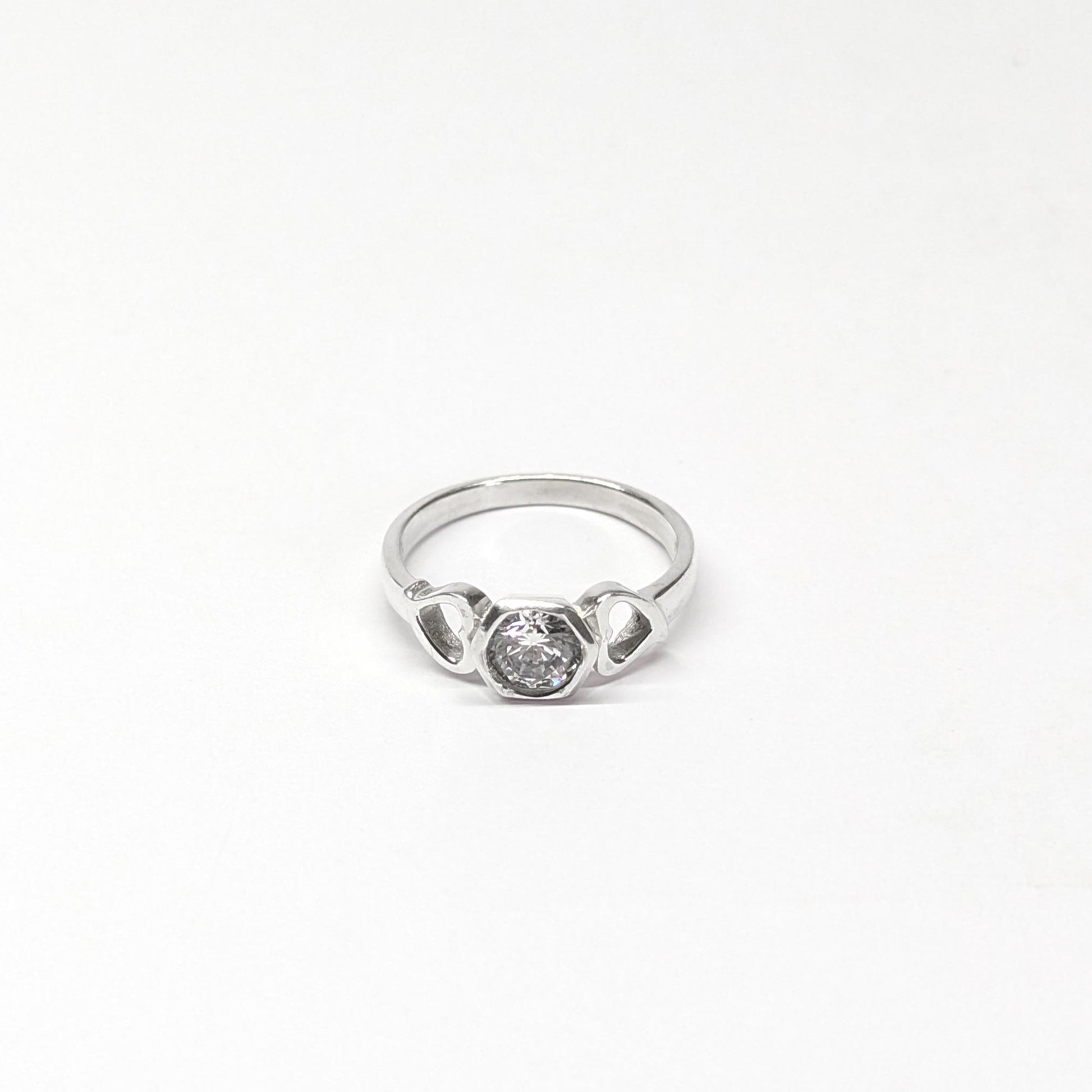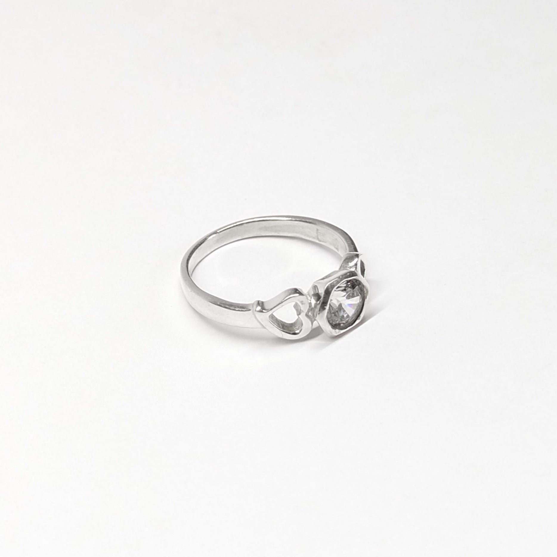 Delicate yet defined, the Celestia Ring is crafted in 925 sterling silver, centered with a round white diamond encased in a soft hexagonal bezel. The open-heart inspired side details add a whimsical, airy touch, creating a silhouette that feels both modern and romantic. It’s the kind of ring that speaks of quiet dreams and graceful power.