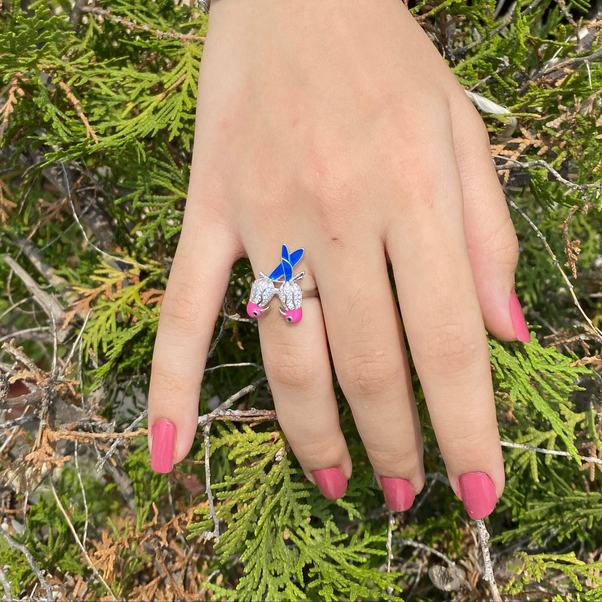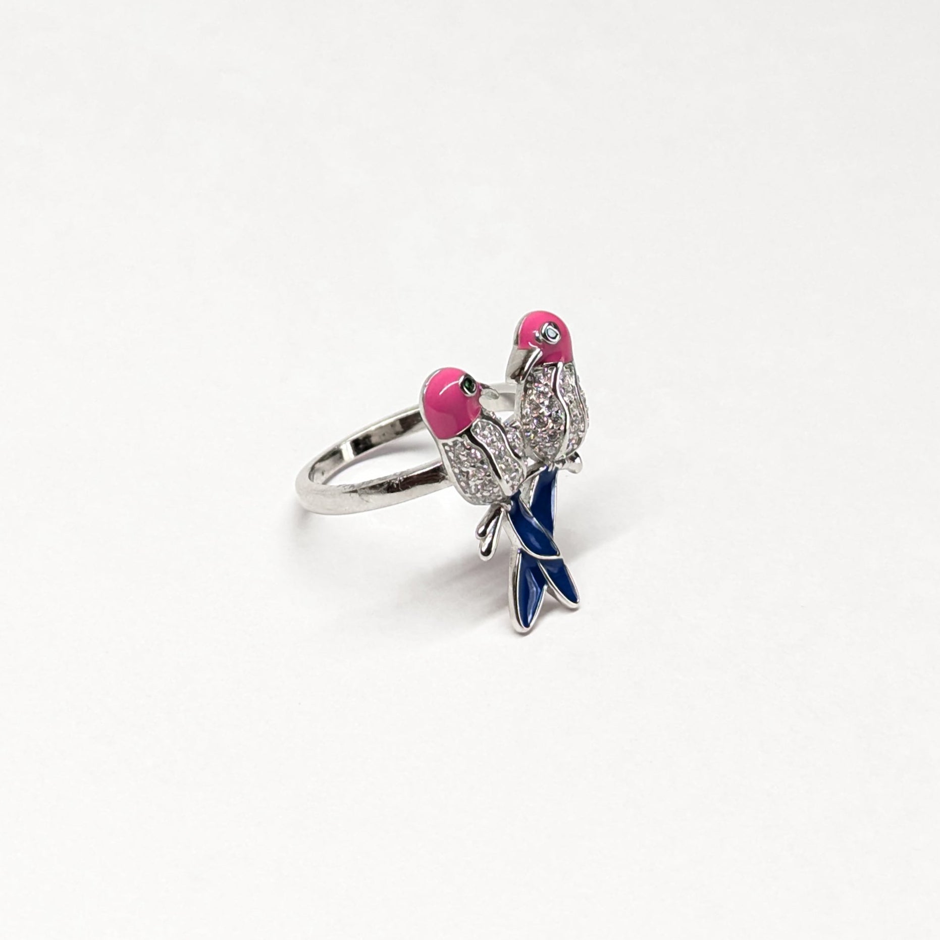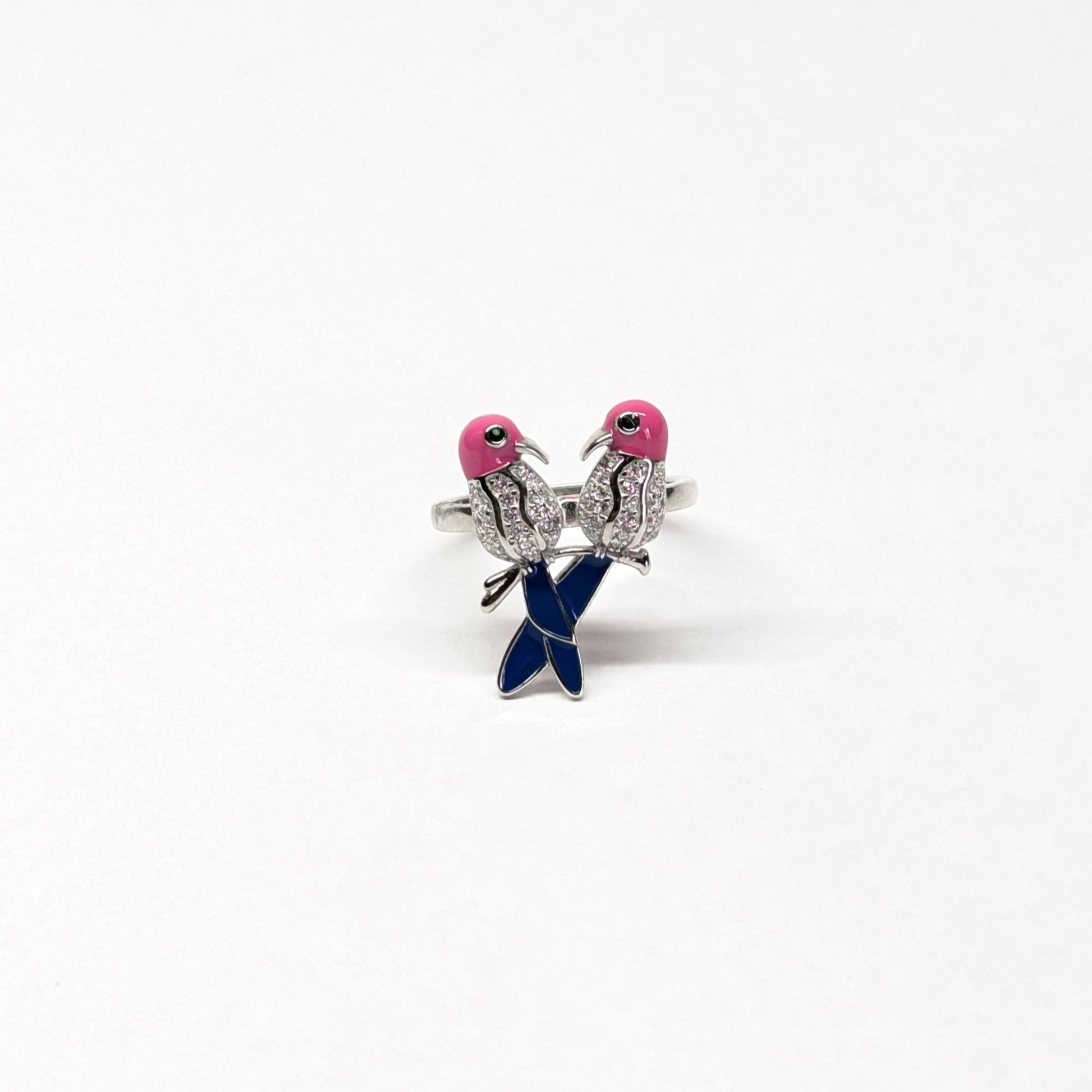 Crafted in 925 sterling silver, the Twin fire Ring features two intricately detailed birds perched side by side. Adorned with sparkling diamonds on their wings, glossy pink enamel heads, and deep blue tails, this ring adds a playful yet elegant touch to your collection. Perfectly capturing the romance of a quiet moment shared, it’s a piece that feels personal and poetic.