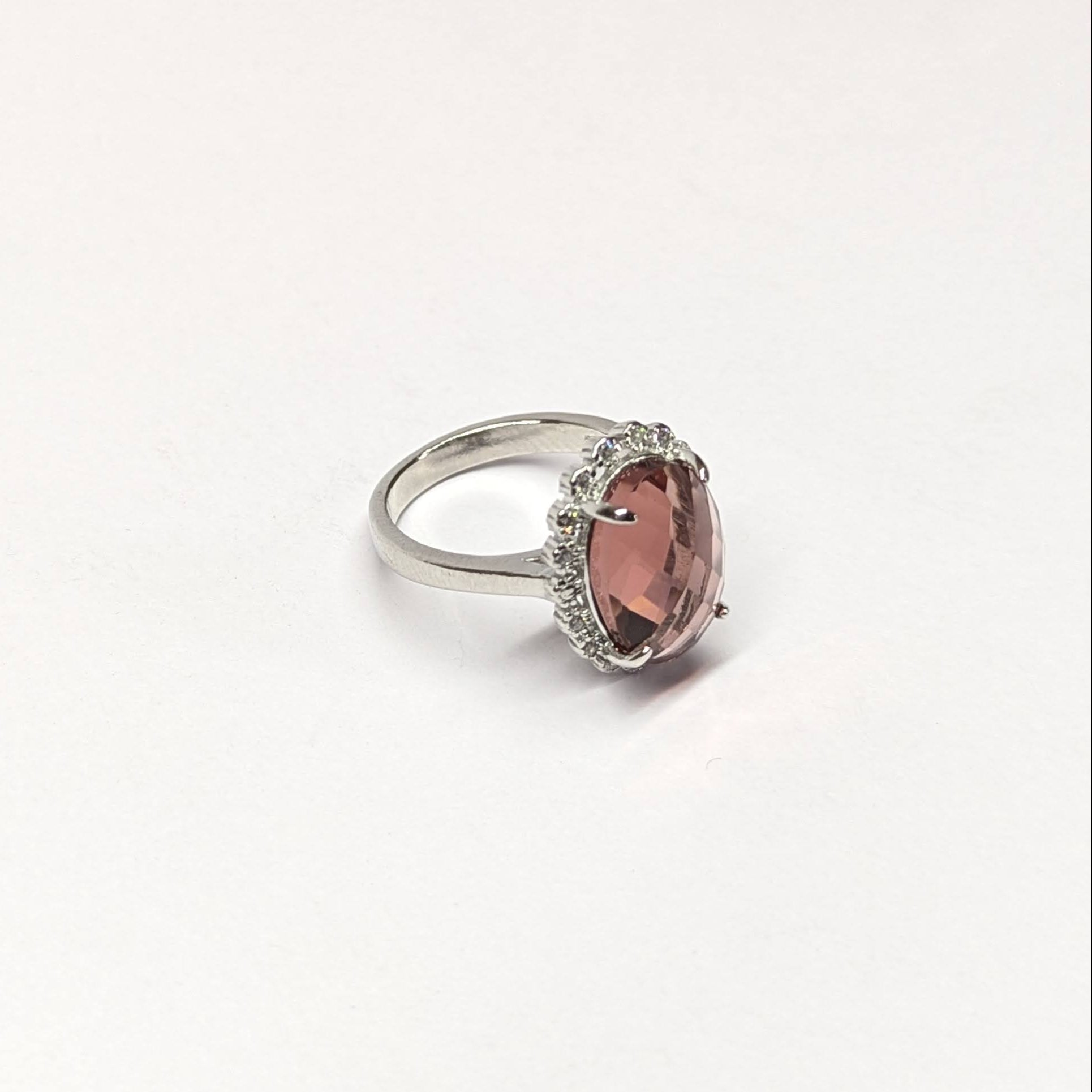 A ring that speaks in elegance and silence, Amaris Oval features a majestic oval-cut stone in a dusky mauve hue, framed by a refined halo of white brilliance. Set in polished 925 sterling silver, this piece channels power. Think heirloom luxury, made modern.