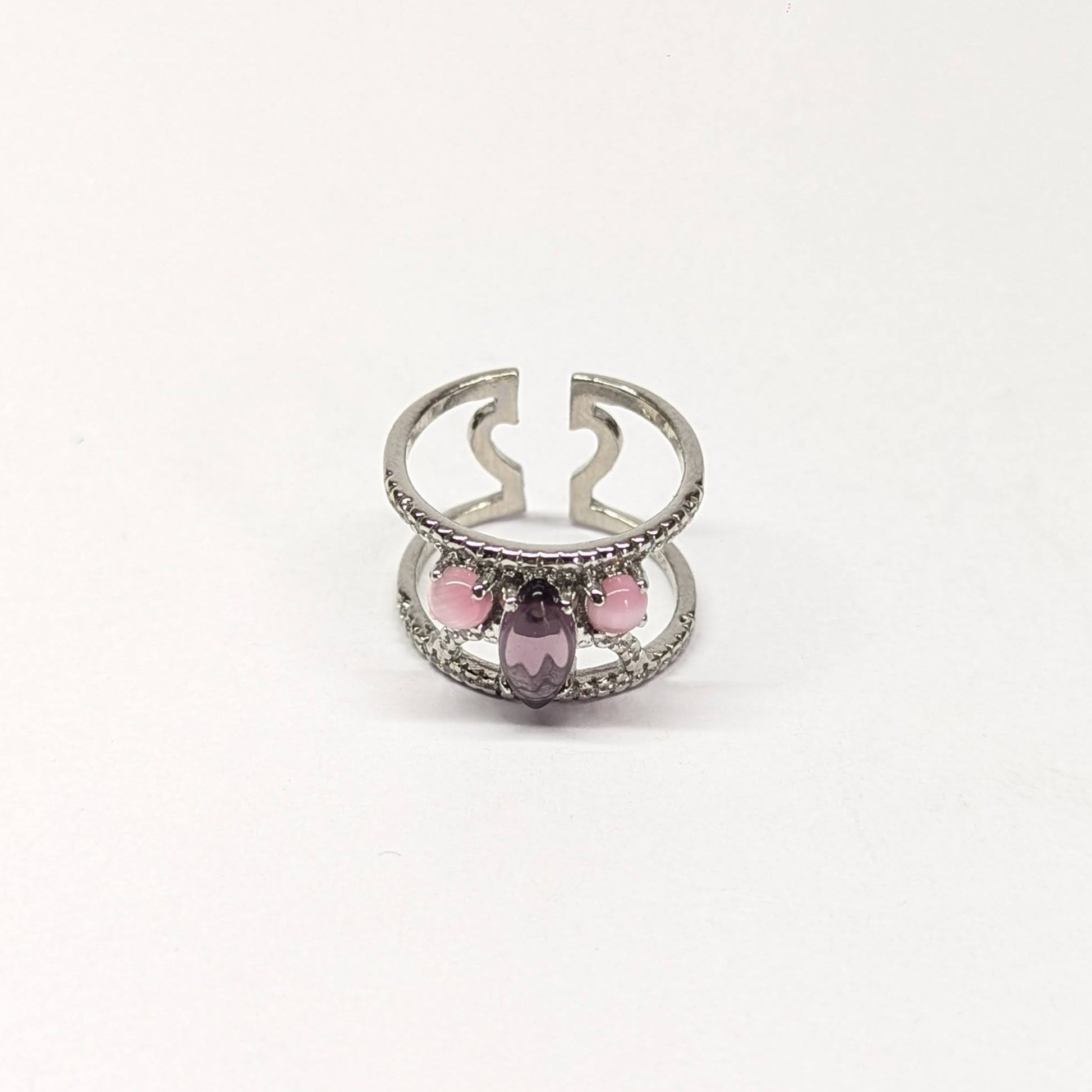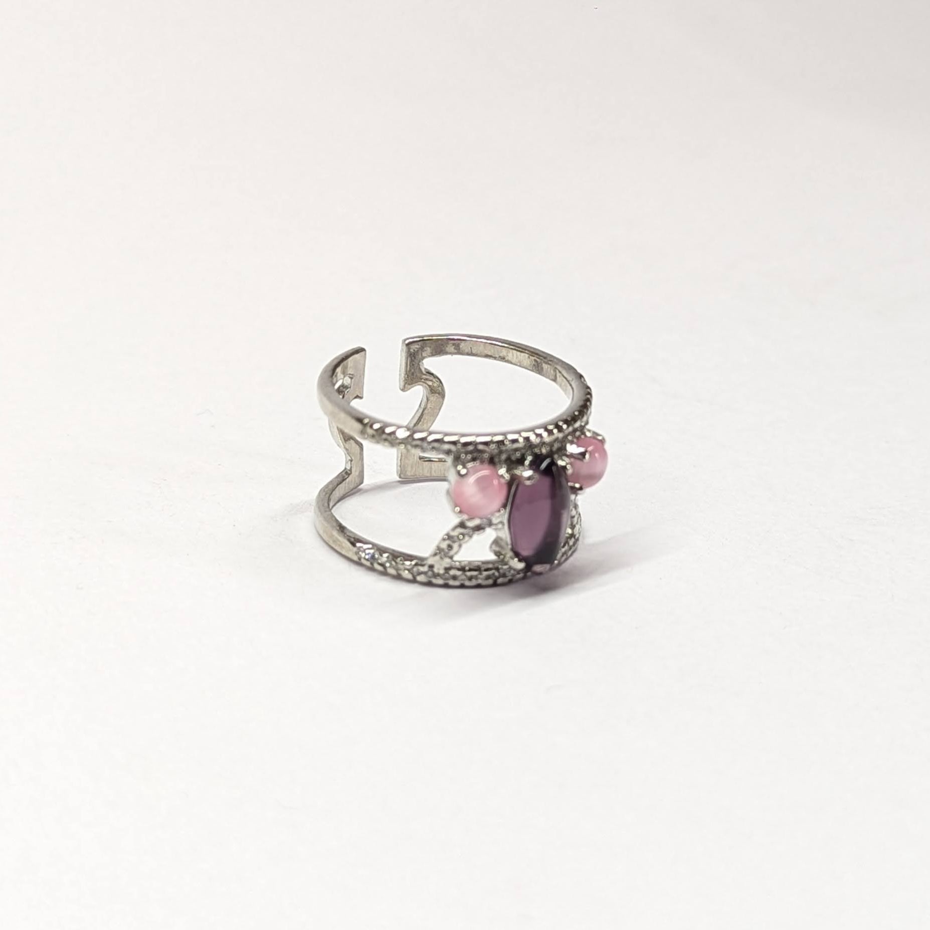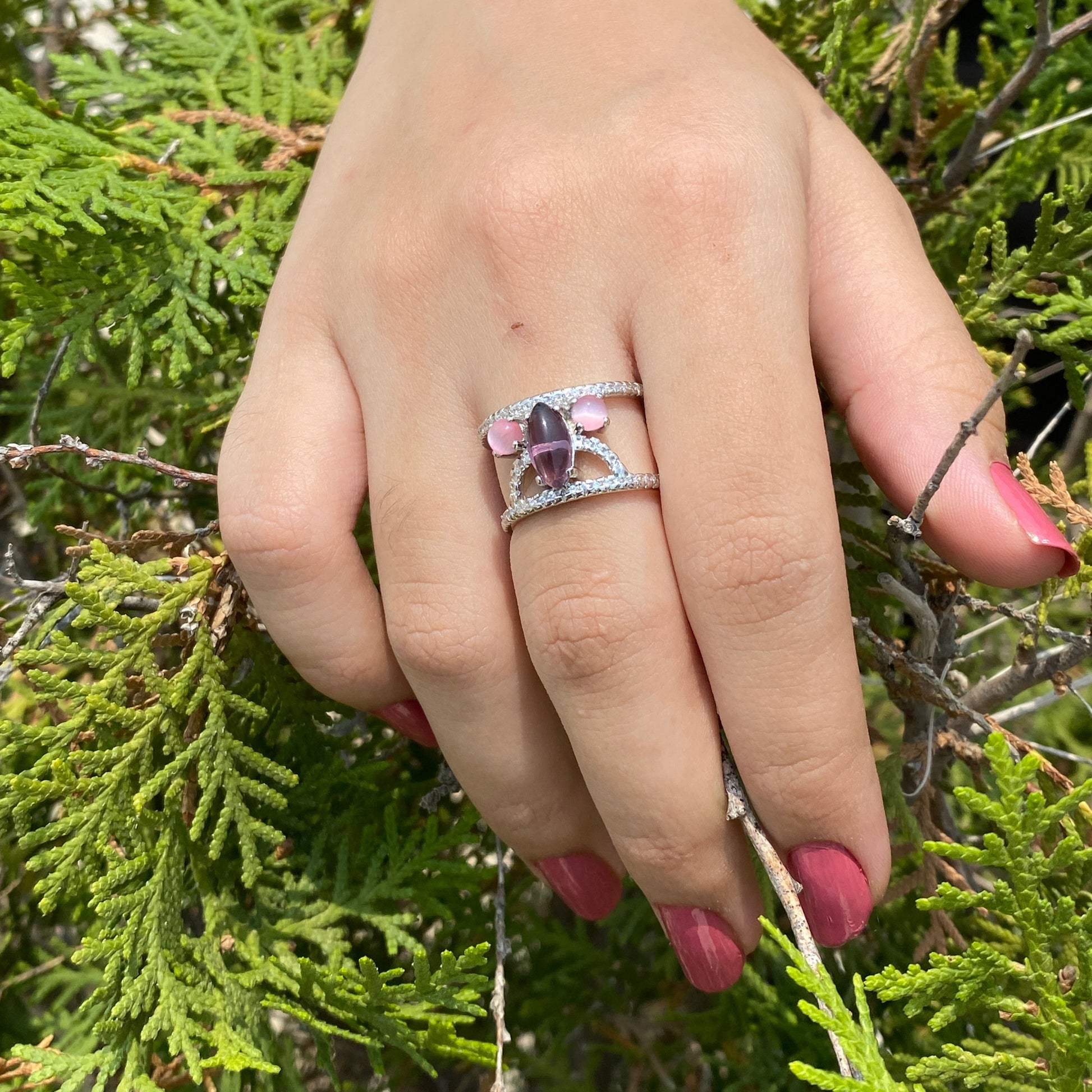 A sculptural statement in 925 silver, the Rosavine Ring features a bold marquise-cut purple center stone, flanked by soft blush-pink accents. Set between two open bands encrusted with fine diamonds, it creates a floating effect that feels architectural yet feminine. A fusion of sharp lines and soft hues, perfect for those who prefer their elegance with edge.