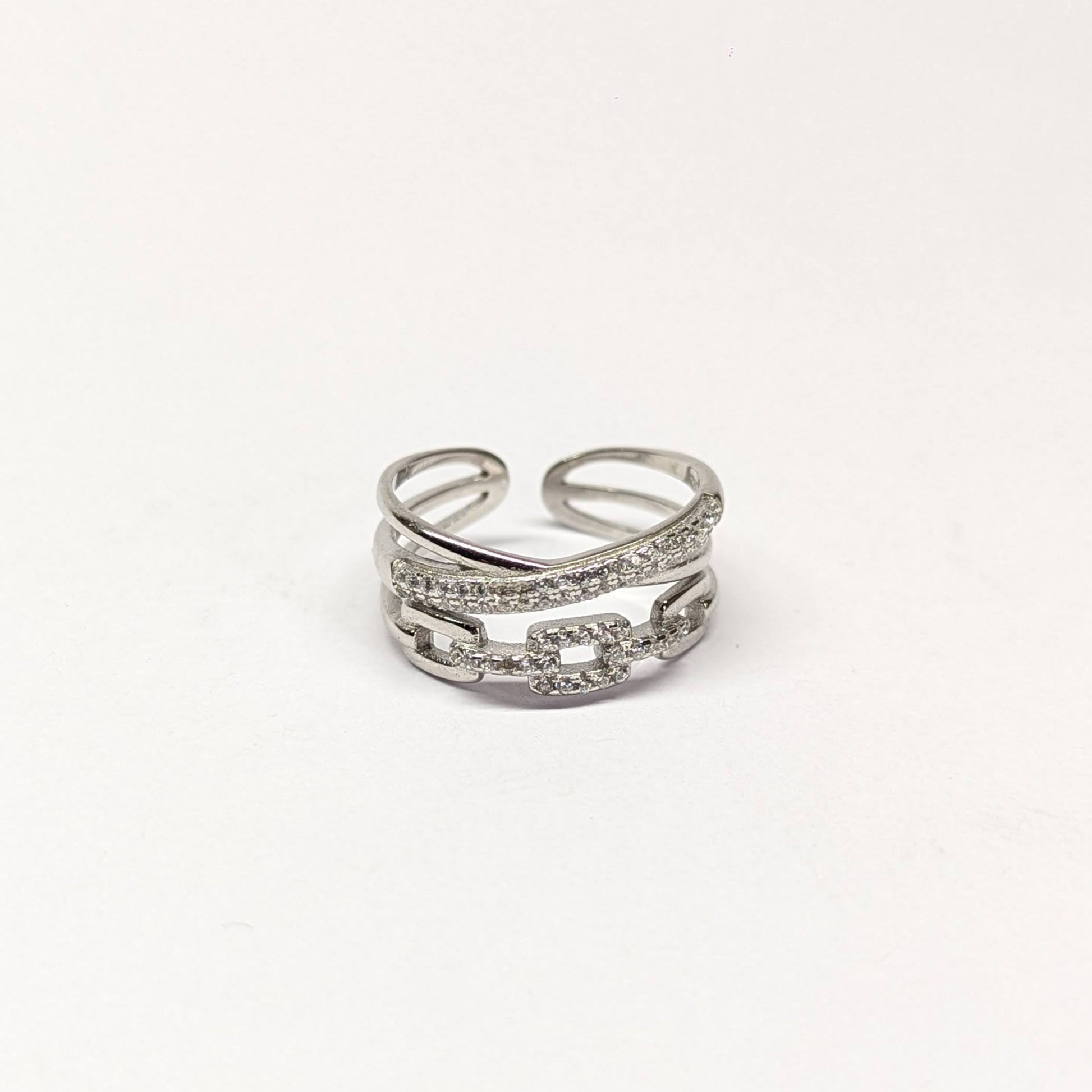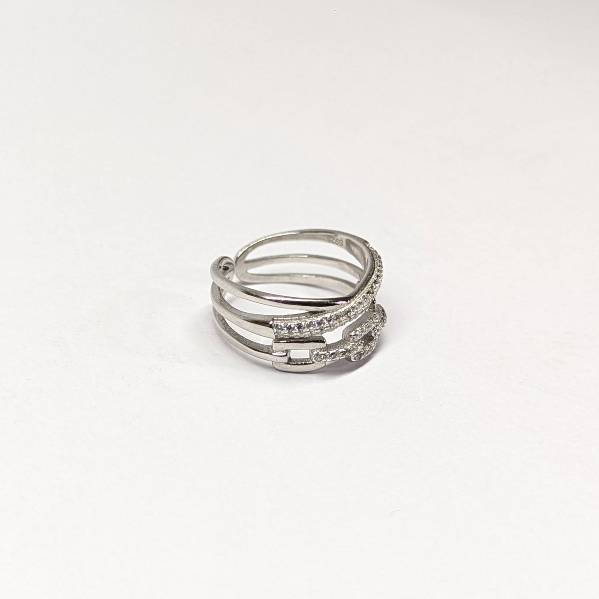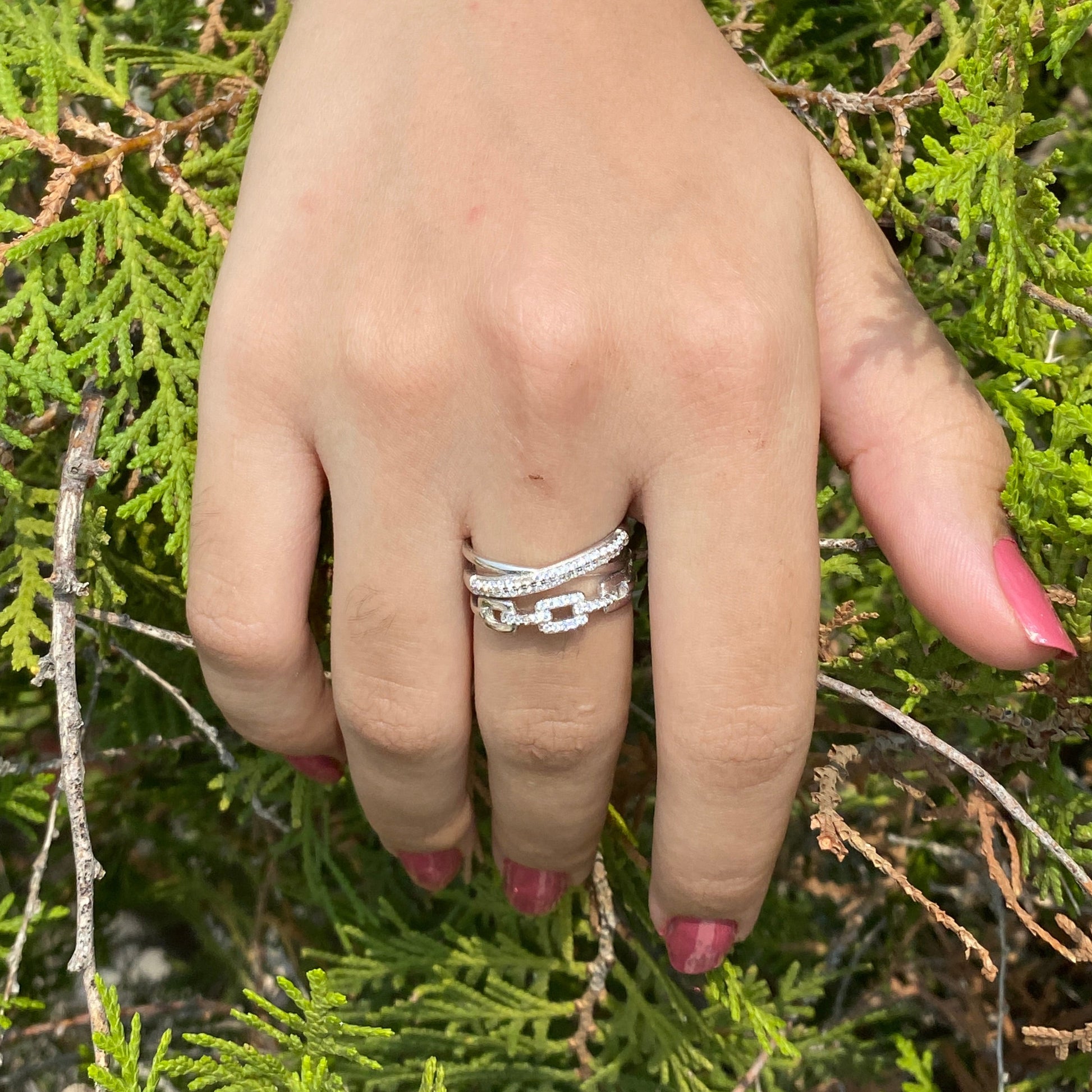 Not your average stack, Triad Gleam is a singular ring designed to mimic the drama of layering. Crafted in polished 925 silver, it features a trio of contrasting bands fused into one statement piece. The base layer is sleek and minimal, crowned by a criss-cross studded band. The showstopper? A bold piece encrusted with diamonds, that sits slightly apart, like a floating fragment of edge. Clean, composed, and strikingly dimensional.